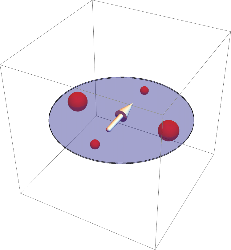 for the motion of the massless disk seen on the right, to which four balls are attached, two heavy and two light ones, with a mass ratio of 10:1 (Mathematica code). The middle animation shows the temporal evolution of the orientation of the three principal axes. There exists even an analytic solution
