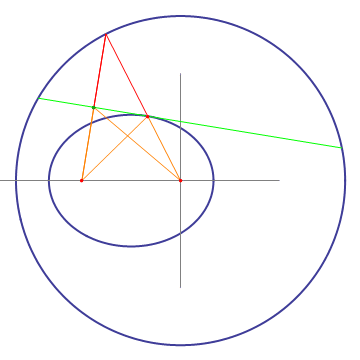 Take a circle and one off-center point. For a given point on the circle, draw a line to the circle's center and to the off-center point. Draw the bisectrix (green) to the line from the point on the circle to the off-center point, and find the intersection of this bisectrix with the line from the point on the circle to the circle center. This intersection will draw an ellipse when the point on the circle moves around. The proof is obvious when realizing that the orange lines are mirror images of the red lines mirrored on the bisectrix.